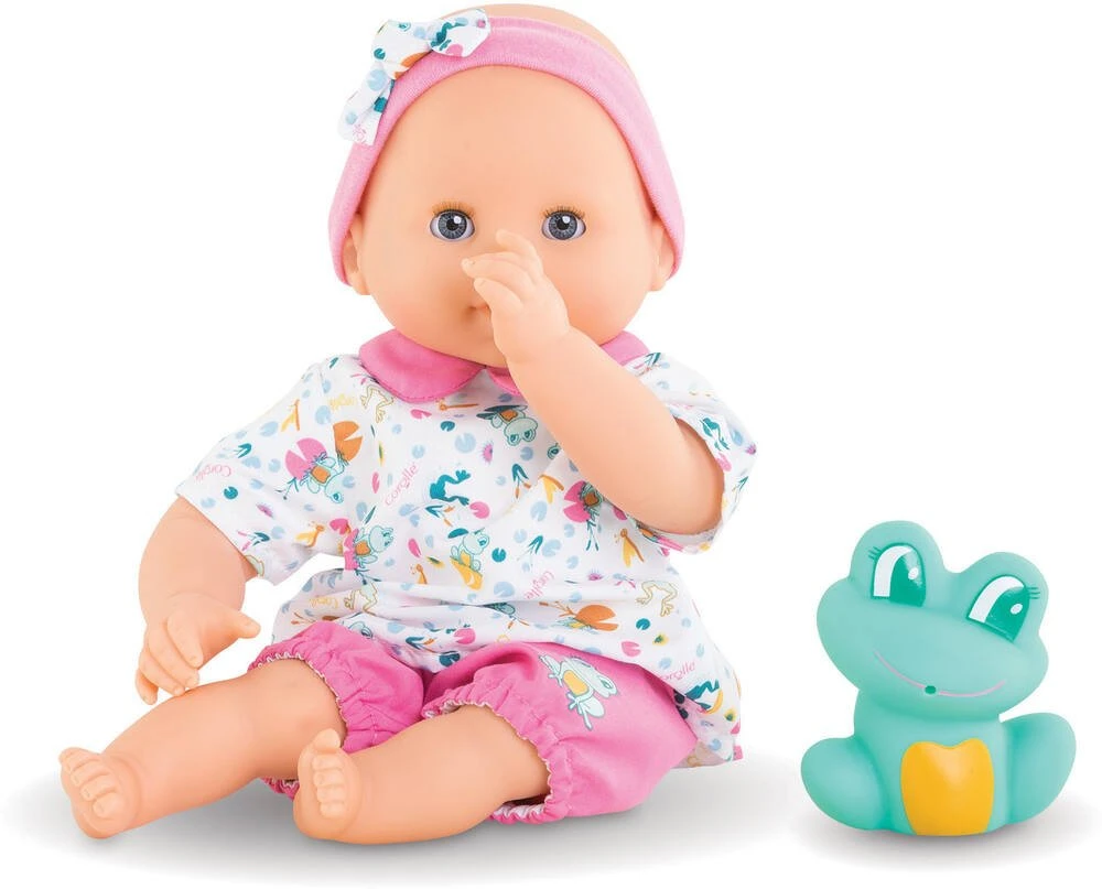 dans le bain (eau savonneuse) Ă la piscine (eau chlorĂ©e) et Ă la mer (eau salĂ©e). Lâattache cousue dans son dos permet de le suspendre pour le faire sĂ©cher aprĂšs le bain et les jeux dâeau. Il mesure 30cm; la taille parfaitement adaptĂ©e aux petits bras et mains de l’enfant pour le manipuler. Son corps souple lui permet de prendre les mĂȘmes positions qu’un vrai bĂ©bĂ©. Son visage; ses bras et ses jambes; Ă la dĂ©licate senteur de vanille; sont en vinyle doux au toucher. Son pouce peut se maintenir dans sa bouche. Avec ses yeux dormeurs; il fait dodo quand on le couche sur le dos. Il est habillĂ© d’une blouse & d’un short et coiffĂ© d’un bandeau assorti. Il est livrĂ© avec une grenouille de bain qui crache de l’eau quand on appuie dessus aprĂšs l’avoir immergĂ©e. BĂ©bĂ© Bain OcĂ©ane dispose d’une collection variĂ©e de vĂȘtements et d’accessoires dans la gamme mon premier poupon Corolle pour pouponner pour la premiĂšre fois.