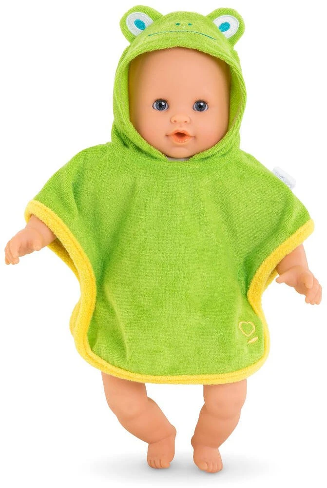 Cette amusante cape de bain Ă la capuche « tĂȘte de grenouille » sĂ©chera et rĂ©chauffera les petits poupons de 30 cm Ă la sortie du bain.