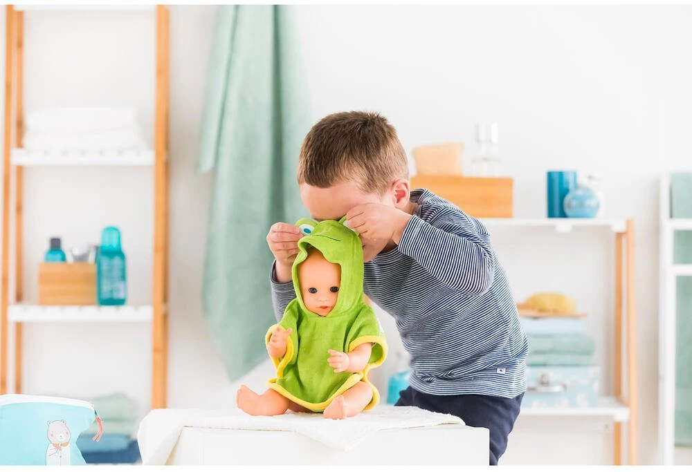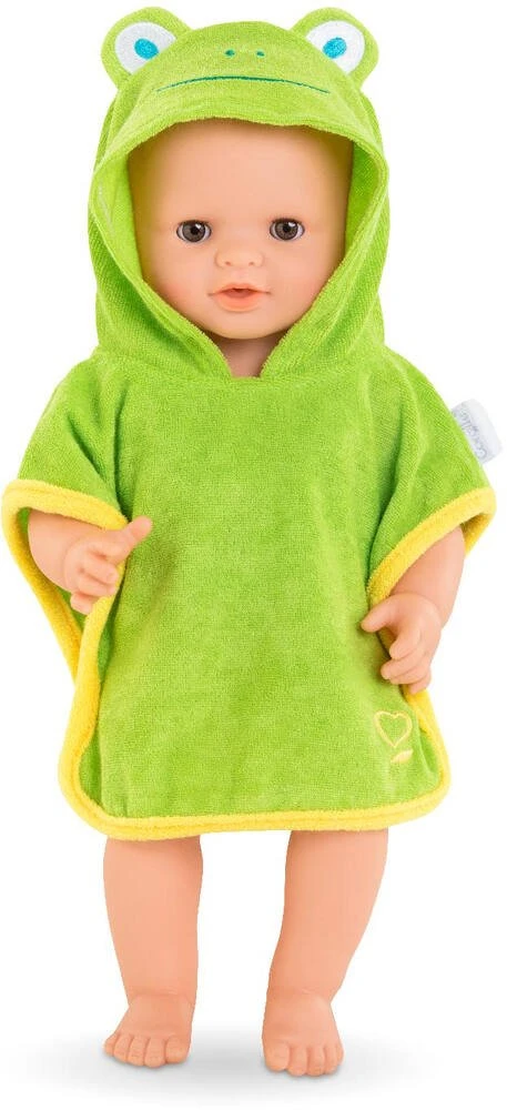 Cette amusante cape de bain Ă la capuche « tĂȘte de grenouille » sĂ©chera et rĂ©chauffera les grands poupons de 36 cm Ă la sortie du bain.