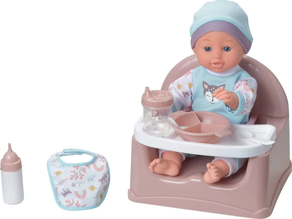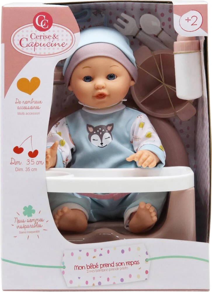 Poupon de 35 cm. Contient : un siĂšge avec un plateau amovible pour le repas, une assiette, une cuillĂšre, une fourchette, un verre Ă bec, un bavoir en tissu et un biberon. Dimensions du siĂšge seul : 22 x 21 x 19 cm