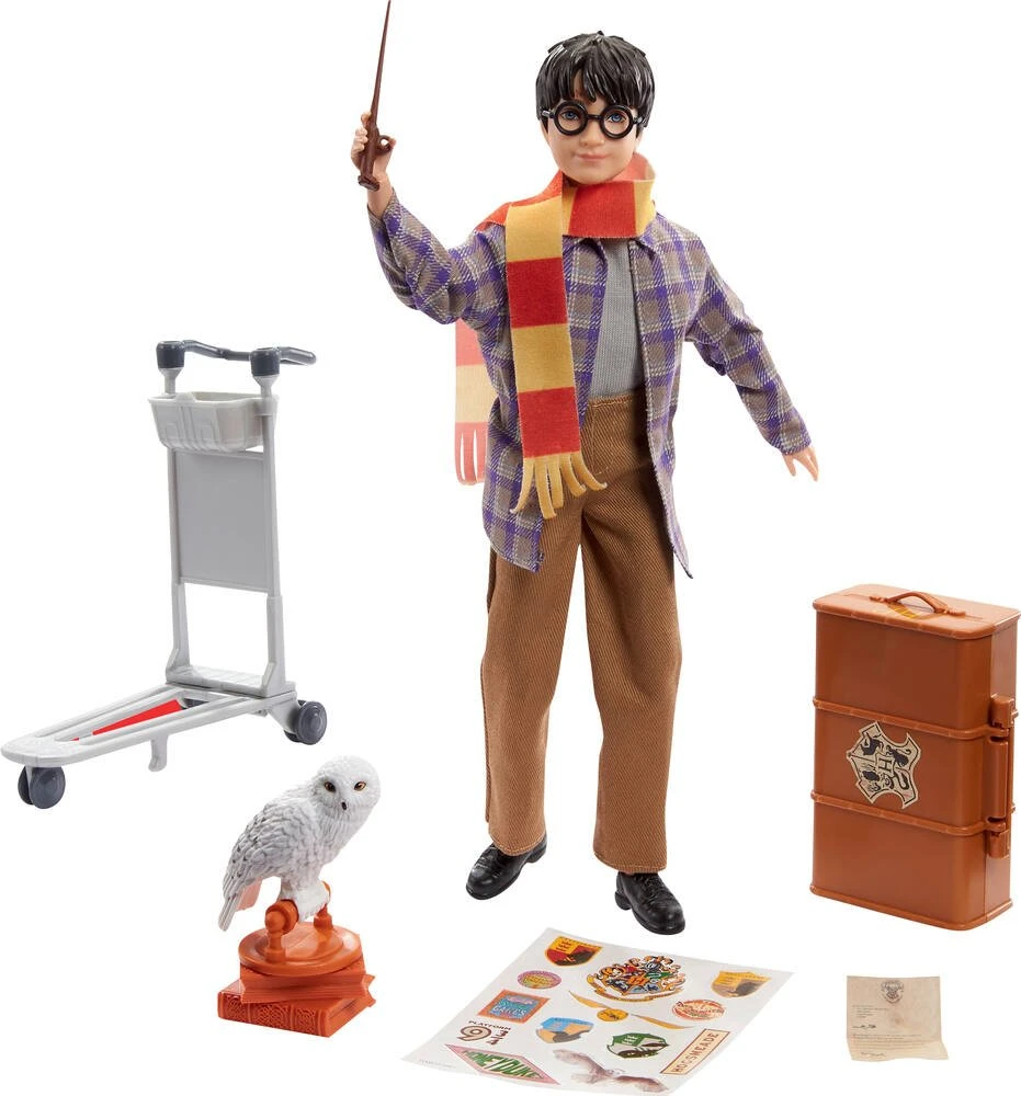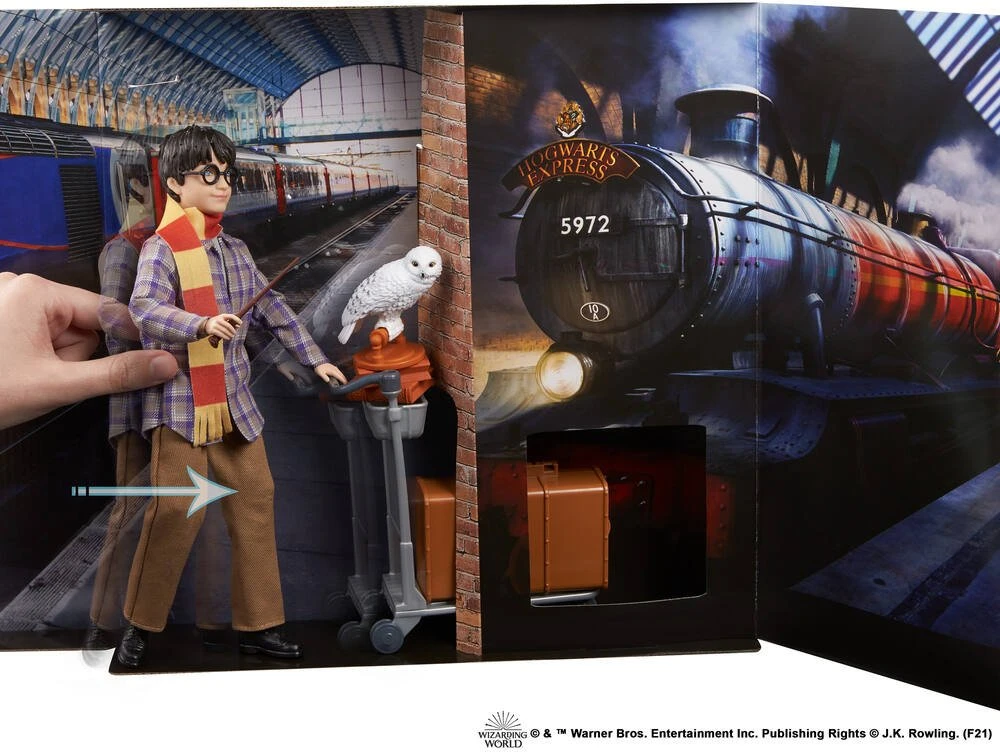En tenue de ville avec Ă©charpe de Gryffondor au cou, Harry emporte sa baguette, Hedwige la chouette, un chariot, une malle et dâautres accessoires.