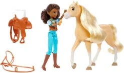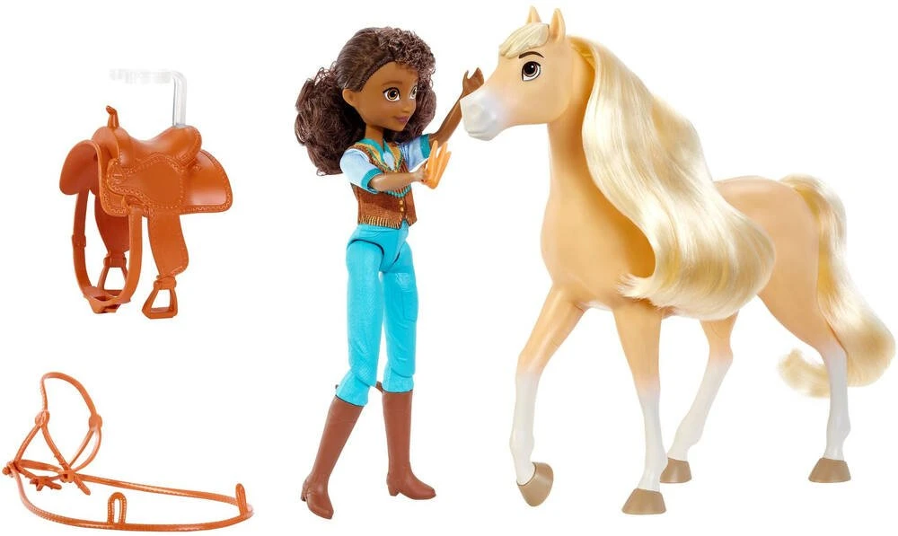 RecrĂ©ez les histoires dâamitiĂ©, de courage et dâaventure de la franchise Spirit des studios DreamWorks avec la poupĂ©e Apo (environ 18 cm) et sa jument adorĂ©e Chica Linda (environ 20 cm) ! Apo porte un jean en plastique moulĂ© et un joli haut en tissu. DotĂ©e de 7 points dâarticulation, elle peut prendre une multitude de poses. Chica Linda peut bouger la tĂȘte pour reproduire son air espiĂšgle et dâautres attitudes, et possĂšde une criniĂšre toute douce. Ăgalement inclus dans le coffret : une selle, des rĂȘnes, une brosse et un ensemble de carottes. Le systĂšme de fixation maintient Apo en selle lorsquâelle monte Ă cheval. Les couleurs et les dĂ©corations peuvent varier.