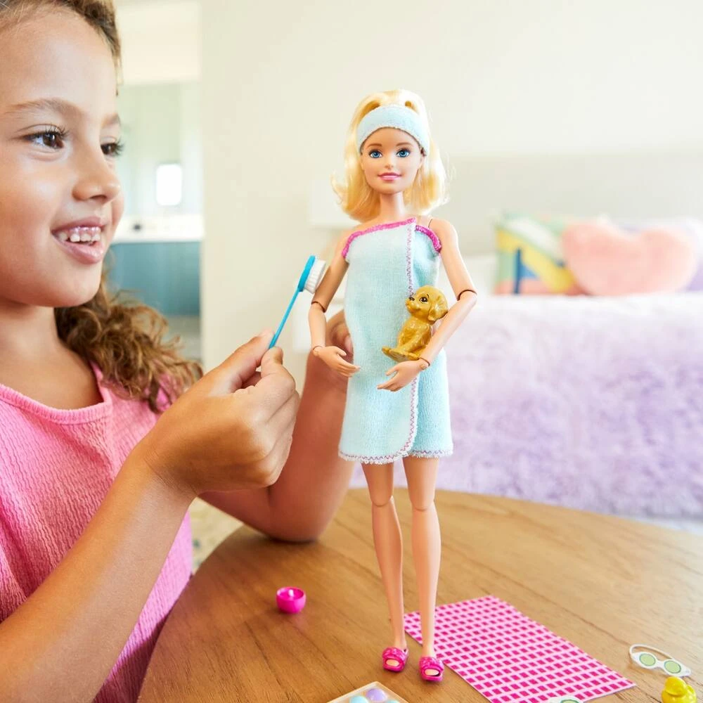 Barbie cultive son bien-ĂȘtre dans cette occasion de jeu associant une poupĂ©e trĂšs articulĂ©e (onze points d’articulation), un chiot et des accessoires assortis Ă la thĂ©matique.