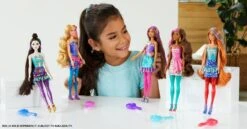 DĂ©couvre le visage de ta poupĂ©e en la plongeant dans l’eau chaude ! Utilise l’Ă©ponge qui rĂ©vĂšle le maquillage et les cheveux de ta Barbie ! 7 surprises sont Ă dĂ©couvrir avec Barbie; Une apparence inĂ©dite de la poupĂ©e, 2 jeux de tempĂ©rature (cheveux, lĂšvres), 1 jupette et 4 accessoires.