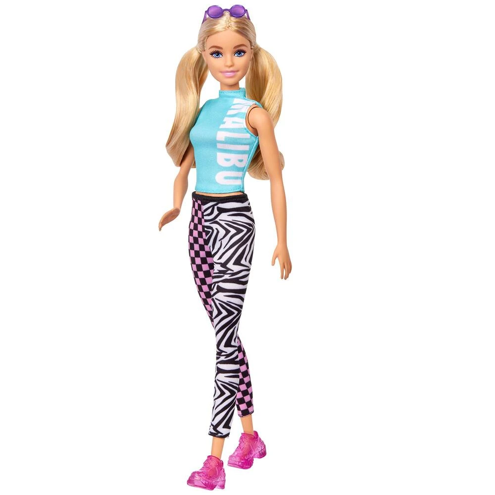 Cette jolie blonde adopte un look sportif et tendance avec son top court et son legging aux motifs à damier et zébrures. La silhouette de Barbie Fashionistas est de taille classique.