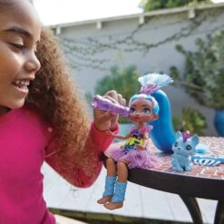Tella est une poupĂ©e de 20 cm de hauteur avec onze points d’articulation. Ses longs cheveux bleu Ă©lectrique et sa houppette en Ă©ventail lui donnent un aspect attachant. Son chat bleu clair la suit partout et une longue vue facilite ses dons de divination. Un peigne est inclus pour le jeu de coiffure.