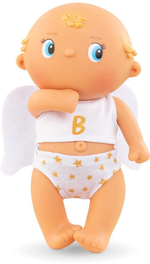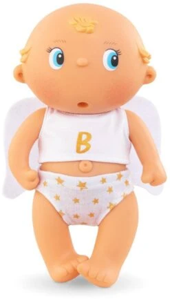 Mini poupon polisson de 20 cm. Les Beedibies ont un corps vinyle et des yeux peints. Comment ne pas ĂȘtre sĂ©duit par leur regard en coin ? Ils sucent leur pouce. Leur petit nombril proĂ©minet est trĂšs rigolo ! Beedibies Gustave est habillĂ© tel un ange; avec de belles ailes blanches (non amovibles) dans le dos. Il arbore fiĂšrement un B dorĂ© sur le devant de son t-shirt blanc et porte une culotte assortie blanche avec des Ă©toiles dorĂ©es. Tous les Beedibies ont une dĂ©licate senteur de vanille.